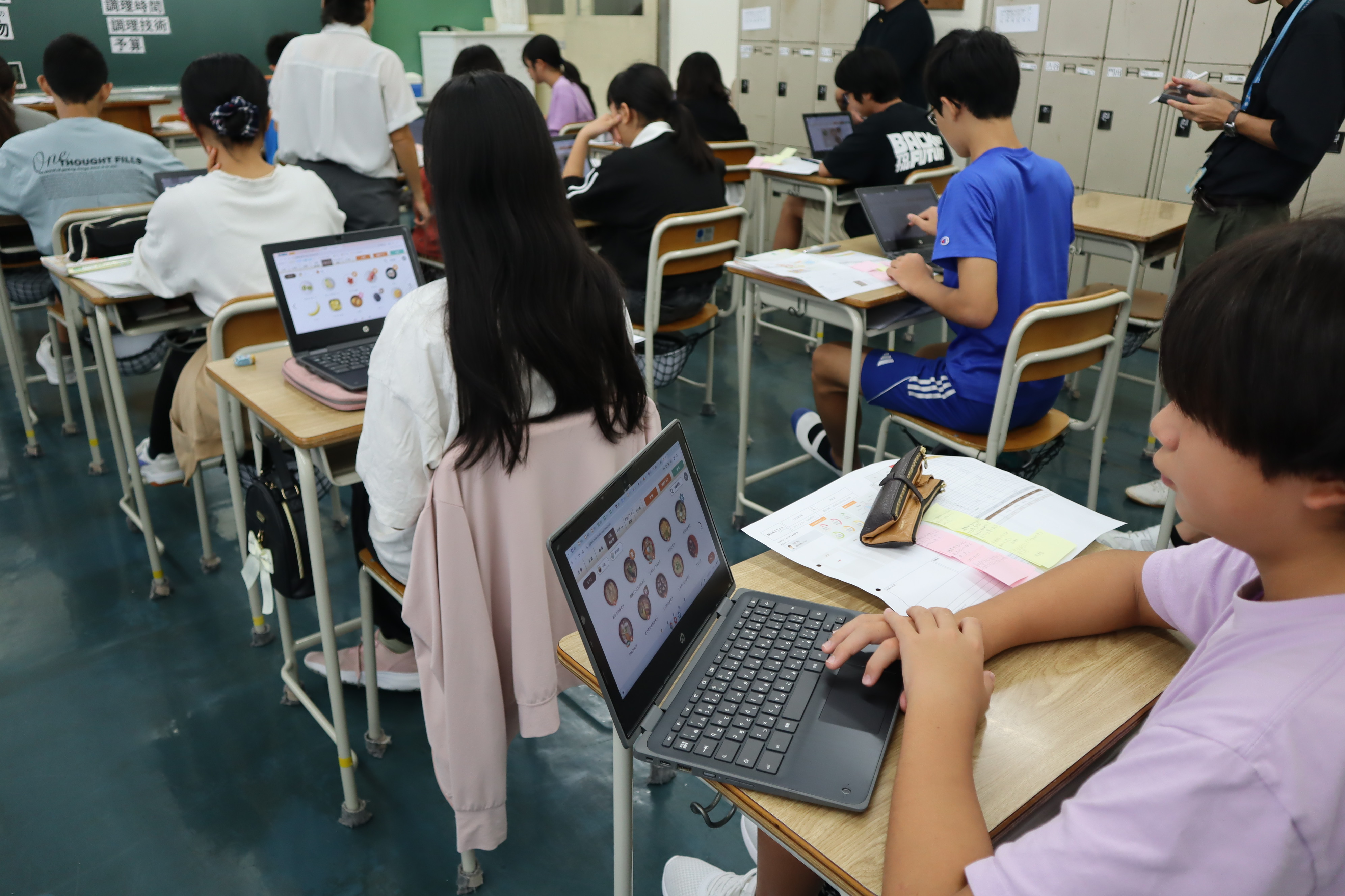1年生の家庭科では、栄養素や食品群の基礎的な知識を理解し、それをもとに中学生にふさわしい1日分の献立を考えることにチャレンジしました。献立作成では、デジタル教材「ミルミル献立計画」を活用し、食品群や分量のバランスを視覚的に確認しながら、楽しみながら献立を立てました。ICT機器の活用により、食品の組み合わせや栄養バランスの調整が容易になり、学びの充実を図ることができました。立てた献立に対して、互いにアドバイスし合う姿もすてきでした。これからもICT機器を活用した「個別最適な学び」と「協働的な学び」の一体的な充実に近づけていけるよう、取組を加速させていきます。