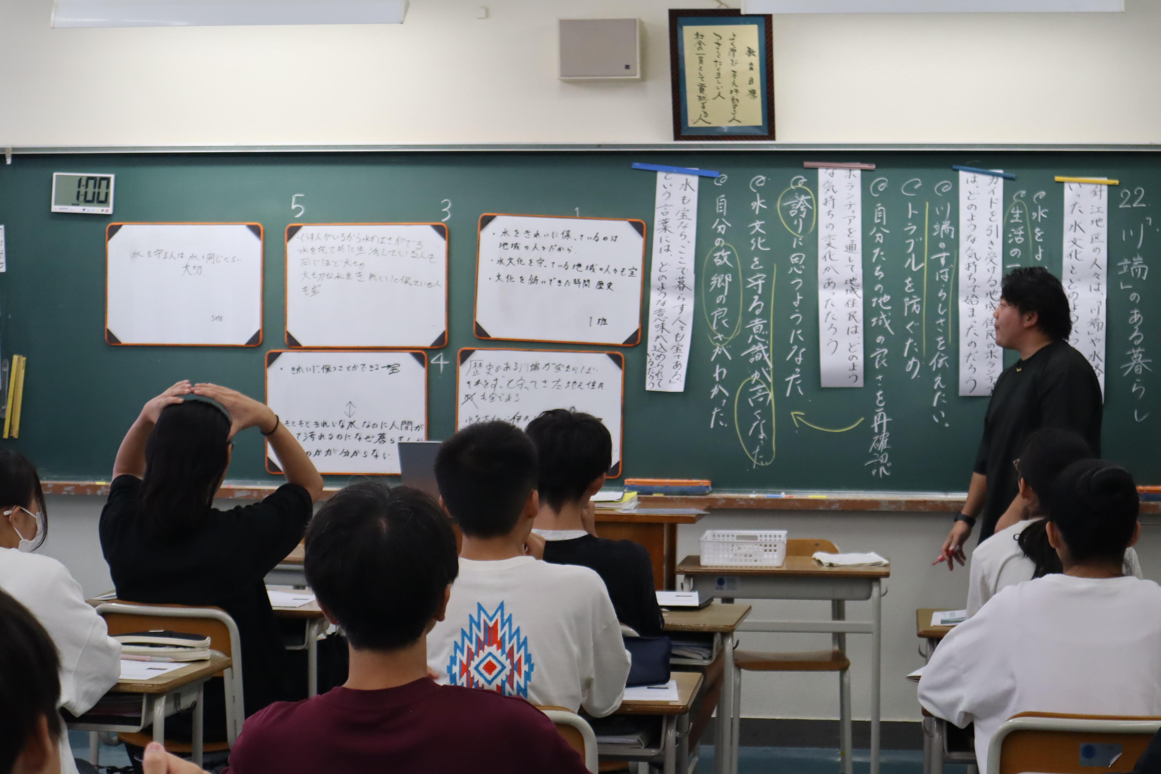 授業後半では、「水も宝なら、ここで暮らす人々も宝である。」という針江地区の方の言葉に注目し、その言葉にはどのような意味が込められているかを考えました。また、自分たちが住む小笠原なら、「宝」はどのようなものになるかも話し合いました。人間が自然と共生していくために、何が大切かをじっくりと考えた1時間となりました。